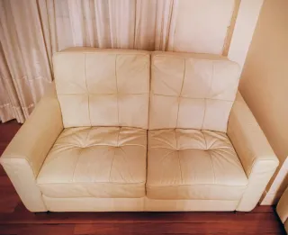 Se vende conjunto de dos sofás de piel en color crudo. - Sofá de 3 plazas. - Sofá de 2 plazas. - Diseño moderno con reposacabezas ajustables.