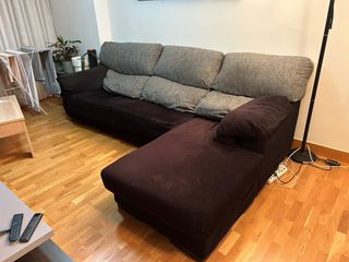 Sofá chaise longue de tela, ideal para tu salón. - Diseño moderno y confortable. - Tapicería suave al tacto. La tela está arañada pero los sillones en buen estado.