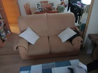 Se venden dos sofás de dos plazas cada uno. Están en buen estado y son cómodos. - Tapicería de tela. - Color beige y marrón.