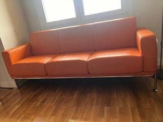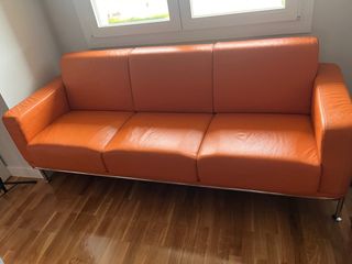 Sofá de tres plazas con un diseño moderno y elegante. - Tapicería de piel. - Estructura metálica. - Color naranja vibrante.