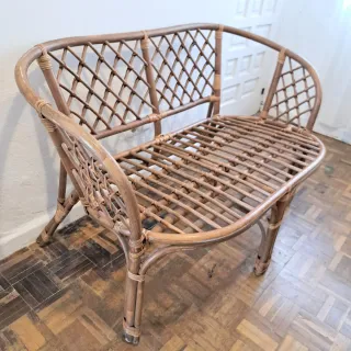 Acogedor sofá de dos plazas, perfecto para espacios pequeños. Su diseño de mimbre le da un toque natural y ligero. Solamente venta en persona. - Estructura de mimbre y ratán. - Diseño de celosía en el respaldo y asiento. - Patas curvas para un estilo único.