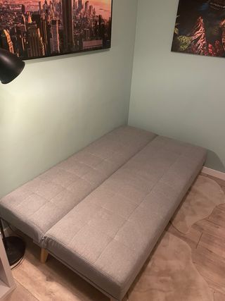 Sofá cama de diseño moderno y líneas rectas. Se adapta a cualquier espacio. - Tapizado en tela. - Patas de madera. En buen estado.