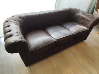 Elegante sofá Chester de tres plazas, con un diseño clásico y atemporal. - Tapicería sintetica. - Color marrón oscuro. - Botones capitoné en respaldo y brazos.