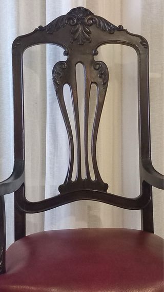 Antiguo sillón estilo chippendale tapizado en cuero color burdeos. Es muy grande.