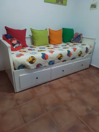 Sofá cama de madera en color blanco, ideal para espacios reducidos. Se abre hasta 1.60 metros.con amplios cajones,también mueble blanco con 4 cajas,sé regala televisión - Medidas cerrado: 80cm. - Diseño moderno y funcional.