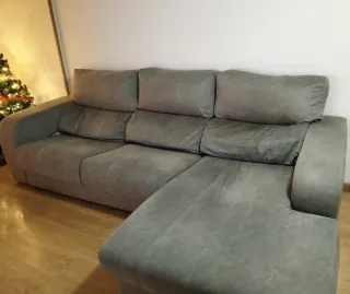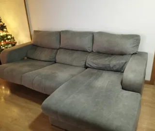 Sofá chaiselonge de gran tamaño, ideal para relajarse. Es de color gris y está fabricado con una suave tela de ante. - Diseño elegante y cómodo. - Perfecto para cualquier salón. - Venta en persona
