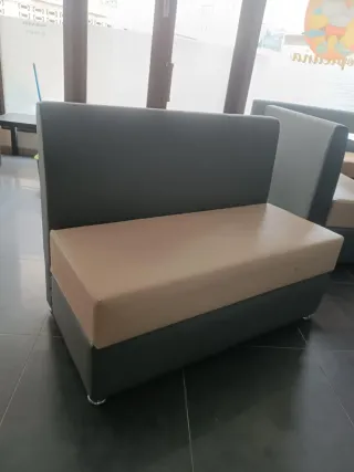Sofá de dos plazas con un diseño moderno y elegante. DISPONGO de más unidades y de diferentes medidas para más información no dudes en escribirme - Tapicería de piel. - Combinación de colores beige y gris.