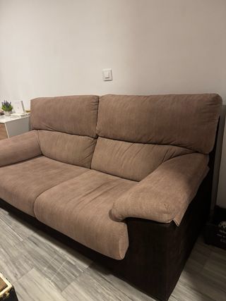 Sofá de tres plazas. Muy cómodo. Signos de desgaste en las orejeras fáciles de cubrir con una funda. - Tapicería en tela. - Estructura de madera. - Tonos beige y marrón.