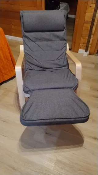 Cómodo sillón Poäng de Ikea, perfecto para relajarse. Su diseño combina una estructura de madera con un tapizado suave. - Estructura de madera. - Cojines de tela. - Color gris.