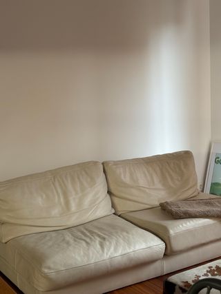 Sofá de cuero blanco roto, en muy buenas condiciones, la piel está sin roces, ni roturas ni desgaste. Medidas: Alto:70 cm Con cojines 90cm Ancho 1 metro Largo: 2 metros