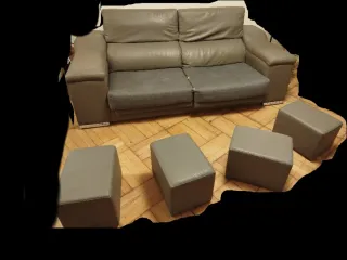 Sofá de tres plazas extensible y reclinable manual, con cuatro "asientos extraíbles" extra que se guardan en los reposa brazos y para usas en casos puntuales. - Tapicería de tela y piel. - Color gris neutro. Fallo en el cojín extraíble izquierdo (ver últimas dos fotos