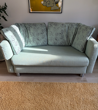 Vendo sofá cama de 2 plazas de la prestigiosa marca alemana Franz Fertig (Die Collection). Es un mueble de alta calidad, robusto y en buen estado. Características: • Medidas: 164 cm de ancho. Ideal para espacios reducidos. • Los reposabrazos son abatibles y se pueden poner totalmente planos. Funciona perfectamente como "day bed" (cama de día). • Muy cómodo tanto de sofá como de cama. Estructura sólida con somier de láminas (ver fotos). • Estilo moderno con cojines estampados. Nota importante: Proviene de un hogar con gatos (aviso para personas alérgicas). A recoger en: Donosti