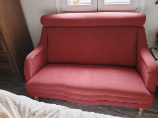 Sofá de dos plazas con un bonito acabado en cuero. Patas de madera. en las fotos parece decolorido, no es así, el color es uniforme. Pero sí tiene algunos desperfectos menores en el apoyabrazos derecho, y rozes en la esquina derecha y atras (vease fotos). - Tapicería de cuero auténtico. - Color rosa suave. - viejo pero con muy poco uso