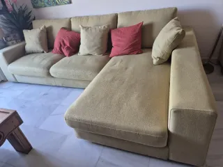 Sofá chaise longue de tela, comprado en prestigiosa tienda Muebles Benítez de fuengirola por 1.850€ hace 3 años. Es un sofá de calidad, no el típico barato de tienda de franquicia. - Muy buen estado. - Diseño moderno y confortable. - Tapicería de tela resistente. - Cojines decorativos incluidos.