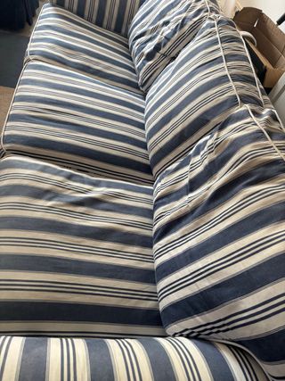 Se venden dos sofás de tela con un diseño de rayas en tonos azul y blanco. - Diseño de rayas clásico. - Tapicería de tela. - Marca Ikea. El de tres plazas mide aprox 210cm y el de dos plazas mide aprox 170 Solo venta en persona, has de recogerlo tu mismo.
