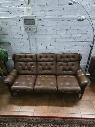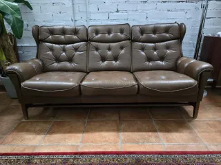 Sofá de piel, en color nude tostado, de marca inglesa , hecho con materiales de alta calidad ( puel de ternera e interior y patas de madera), y es también muy còmodo. Lo hemos usado durante tiempo , aunque lo hemos cuidado muy bien . Solo tiene algunas marcas en las costuras de desgaste, y es algo que casi no se aprecia.