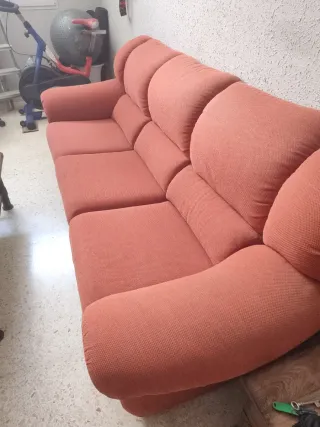 Abstenese de escribir mareantes!! Cómodo sofá de tres plazas con un diseño moderno y acogedor. -tres plazas más una, que está disponible dentro del precio. Se añade al sofá, ya que las piezas se pueden separar. Además se incluye un apoya piernas de una plaza. - Tapicería de tela. - Color naranja vibrante. -No se envía. Recogida a domicilio. Presto carretilla para llevar hasta el vehículo. Hay rampas para su traslado. Ideal para casa de campo o salón rustico.