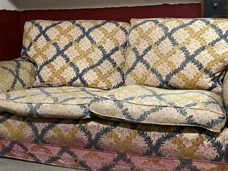 Sofá de tela con un bonito estampado. - Diseño con rombos y motivos florales. - Tonos beige y azul predominantes. el faldón está deteriorado por humedad y los colores se han decolorado por eso vendo barato la estructura está intacta está hecho por un tapicero hecho a medida