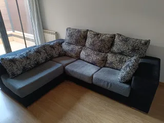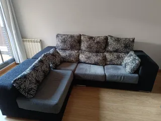 Cómodo sofá modular de tres plazas. Aunque no está en perfectas condiciones aún le queda uso. Tiene almacenaje debajo del chaiselonge. Los asientos se abren haciendo el sofá más amplio para poder dormir. Dispongo de ascensor. Imprescindible dos personas para transportarlo. - Tapicería de tela. - Cojines en dos tonos: gris y blanco.