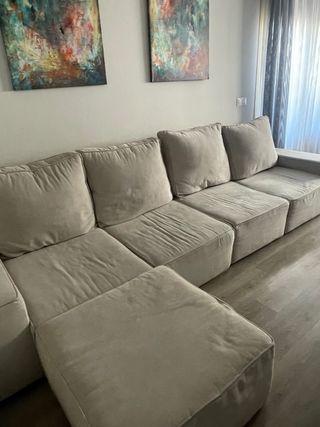 Sofá modular de gran tamaño, perfecto para salones amplios. Su diseño moderno y su color neutro lo hacen muy versátil. - Medidas totales: 3,30 metros de ancho. - Tapicería de tela suave al tacto.