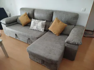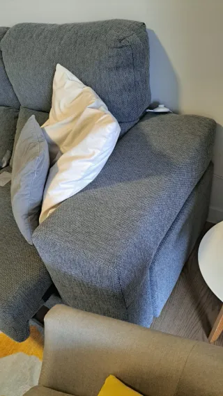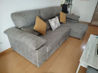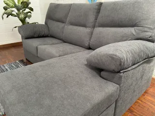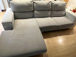 Sofá chaiselongue en color cemento. Un mueble cómodo y espacioso para tu salón. Canapé y respaldo requinables Tiene un pequeño arañazo de mi gato en un lateral ,se aprecia en foto. Uso de poco más de un año - Diseño moderno. - Tapizado en tela. - Estructura resistente.