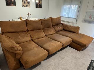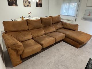 Sofá chaiselongue de gran tamaño en un cálido color camel. Medidas: 280 cm de ancho, chaise longue de 170 cm. Ideal para salón grande, muy cómodo y con asientos amplios. - Tapicería de tela tipo ante. - Amplia zona de chaiselongue - Respaldo alto y mullido. Tiene algún desgaste del uso en el tapizado. No tiene ningún roto ni descosido. 📍 Ubicación: Getafe 🚚 Recogida por el comprador ACEPTO OFERTAS REALISTAS