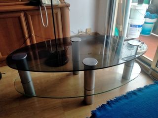 Bonita mesa de cristal ovalada con dos cristales, el superior oscuro y el inferior transparente. Ademas las patas tienen unas pequeñas ruedas que no se ven para poder moverla. Tiene su uso, pero en general esta bastante bien. Mide 110 cm de larga, 55 cm de ancha y de alta 50 cm. - Encimera de cristal tintado y transparente. - Patas y estructura de metal plateado. - Diseño ovalado.