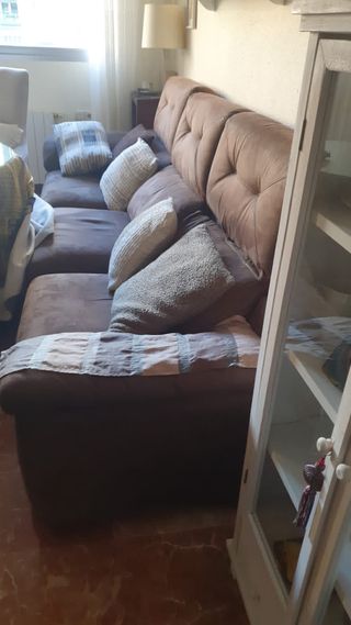 Sofá de tres plazas con un diseño espacioso y confortable. Su tapicería combina texturas para un acabado elegante. - Amplio espacio para sentarse. - Asientos extraíbles - Brazos con almacenaje para mantas - Acabado suave al tacto. - Bastante grande: 2,85m de largo Tiene algunos desperfectos de ahí el precio: uno de los asientos no se abre del todo, uno de los brazos marcado por la plancha que ha oscurecido la tela, uno de los respaldos no unido al asiento por estar descosido. Por lo demás, el sofá muy bien, no tiene arañazos, desgarros ni pérdida de relleno. Lo seguimos utilizando actualmente pero se vende al cambiarlo por otro.