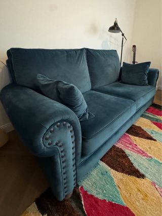 Precioso sofá de dos plazas de terciopelo azul petróleo, tela aquaclean antimanchas que es una maravilla. Tiene 2 m de largo, 1 m de fondo, es comodísimo. Los asientos y respaldos se pueden desenfundar y lavar en lavadora. Incluye dos cojines del mismo material. Comprado hace 2 años, precio de compra 1.100,00 €. Se vende por mudanza - Tapicería suave y confortable. - Diseño con tachuelas decorativas en los brazos. - Cojines mullidos para mayor comodidad.