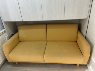 Sofá cama de tela en color amarillo mostaza, perfecto para cualquier espacio. Con diseño moderno y elegante y patas de madera. Usado como cama en una sola ocasión. Muy fácil de sacar la cama en un solo tirón del asa. Costo 600€. Lleva solo una pequeña mancha visible en una foto. - Incluye colchón. Nuevo - Patas de madera.