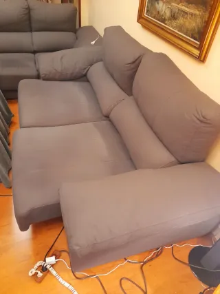 Conjunto de sofá y sillones. Se pueden comprar por separado o conjuntamente. Vamos a reemplazarlos y queremos desprendernos de ellos. Tienen signos evidentes de desgaste: tiene algunas cremalleras rotas y uno de los sillones no dispone del reposapies relax. Precio sofa (los asientos pueden sacarse para tener mas fondo): 150€ Precio sillón (unidad): 60€