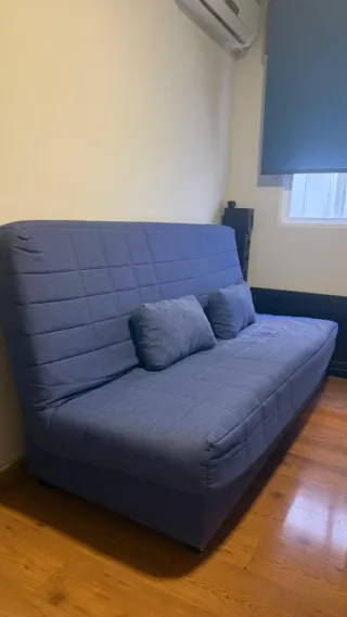 Sofá cama de dos plazas en color azul. Es un mueble práctico y cómodo. Se vende Sofá cama por cambio de mobiliario y vivienda. Como nuevo, sin uso. - Tapicería de tela. - Diseño moderno. Medidas 180 x 90 (fondo) x 110 altura. Consta de cama desplegable de tamaño 170 cm x 130 cm