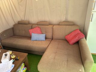 Sofá chaise longue en color camel, muy práctico y funcional: ✔️ Chaise longue con arcón para almacenaje 🧺 ✔️ Cama extraíble ideal para visitas 🛏️ ✔️ Incluye cojines a juego ✔️ Tapizado resistente y fácil de limpiar 📏 248x82 alto 95 📲🚛623//591//634