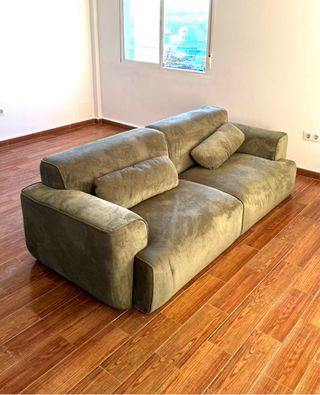 Sofá modular de terciopelo en un bonito tono verde oliva. Sus líneas modernas y su tacto suave lo convierten en un mueble muy acogedor. - Diseño modular. - Tapicería de terciopelo. - Color verde oliva. Compré este sofá en noviembre. Motivo de la venta: Cambié de opinión y quiero otro modelo. Es muy cómodo y tiene un color increíble. Tenga en cuenta que está en el sexto piso y no cabe en el ascensor. Dos personas pueden bajarlo, igual que dos personas lo subieron. No puedo ayudar con la mudanza.
