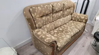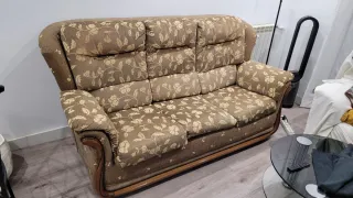 Sofá de tres plazas con un diseño clásico y elegante. Se encuentra en buen estado y es perfecto para cualquier sala de estar. SOLO RECOGIDA EN MANO. - Tapicería de tela con estampado floral. - Estructura de madera visible en los brazos y la base.