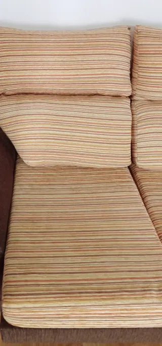 Sofá de dos plazas con un diseño moderno y cómodo. - Tapicería de tela a rayas beige y marrón en perfecto estado. El tapizado está como nuevo, con poco uso. - Estructura de madera, segura y confortable. La parte de los asientos mide 85 cm recogido el asiento y al extienderlo llega hasta la medida de 105 cm. Tiene protección en la zona lumbar y los cabezales se pueden reclinar de manera independiente en cada asiento como se aprecia en las fotos. Los reposabrazos se pueden retirar con facilidad con la cremallera que permite un ajuste adecuado.