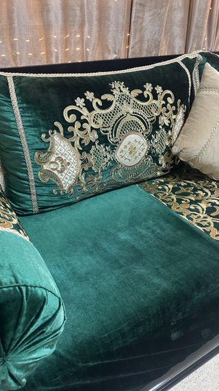 SOLO VENDO LAS TELAS NO LOS SOFAS NI MAS MADERA!!! Sofá de estilo marroquí con un diseño elegante y llamativo. Sus colores y texturas aportan un toque de distinción. - Tapicería de terciopelo. - Detalles bordados en dorado. - Base y cojines en tonos verdes. - 6 almohadas grandes 3 largos y 4 pequeñas 2 tienen 1m94 1 tiene 2m17