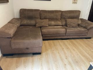 Cómodo sofá chaiselongue en color marrón. Perfecto para tu salón. - Tapicería de tela y ante. - Diseño moderno y funcional. Medidas 320 cm de ancho por 180 de chaiselongue.