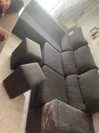 Conjunto de sofás de tela en color gris, ideal para tu salón. - Sofá de 3 plazas. - Sofá de 2 plazas. - Tapicería de tela suave. Sofa cama ambos, muy cómodo Poco uso, siempre con funda por los gatos( se regala la funda si la queréis) Tieen dos esquinas un poco arañadas pero no estan mal Me costo 1000€, es una tela amtimanchas Tiene 4 puff También se puede vender por separado