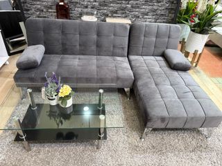 Conjunto de sofá seccional y mesay 4 sillas. - Sofá seccional de tela en tono gris. - Mesa auxiliar a juego.