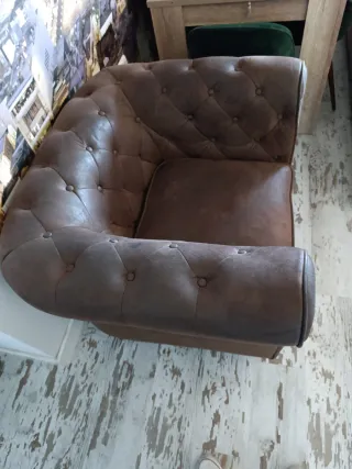 Elegante sillón individual, perfecto para cualquier rincón. - Diseño clásico tipo Chester. - Tapicería de piel. - Patas robustas.
