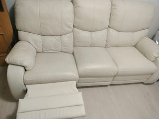 Se vende juego de sofá de tres plazas y sillón, ambos de piel en color beige. Son reclinables los dos asientos laterales del sofá, donde aún se conserva el plástico original de fábrica y el sillón es extensible por completo, tanto los pies como el respaldo. Las dos piezas están en perfectas condiciones salvo en algunas zonas donde se aprecia la piel cuarteada del propio uso, tal y como se muestra en las fotos. Pero han estado muy cuidados, permaneciendo desde que se compraron tapados con tela para evitar el roce. Medidas Largo: sofá 2,20m y sillón 1,10 Fondo: 1m Altura: 1m Se puede recoger en persona en Pamplona ciudad.