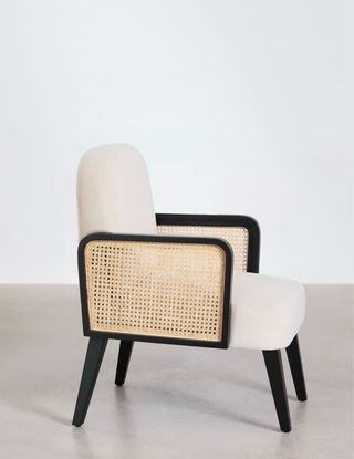 Elegante butaca con un diseño moderno y materiales de calidad. Perfecta para añadir un toque de estilo a cualquier espacio. - Estructura de madera robusta. - Acolchado confortable en tela. - Detalles en ratán en los reposabrazos.