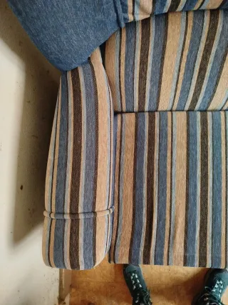 Sofá de estilo vintage con un diseño de rayas en tonos azules y beige. Aporta un toque retro a cualquier espacio. - Tapicería de tela. - Diseño de rayas verticales. Perfecto estado, sin manchas ni signos de desgaste.
