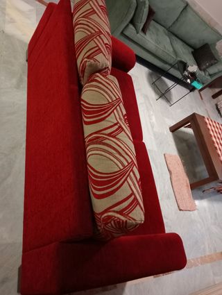 Sofá de dos plazas en buen estado. - Tapicería de tela. - Color naranja vibrante. - un poco blando por el uso pero muy confortable. -caben 3 personas - fundas lavables - Fácilmente desmontable en dos. Recogida en piso sin escaleras. Puedo escuchar ofertas razonables.