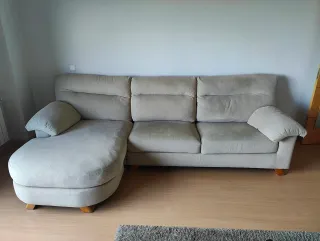Sofá Chaiselongue comodísimo! 276 cm de ancho y 150 cm de fondo, color Beige/Arena. - Gomaespuma de respaldos y asientos en buenas condiciones. -Estructura en muy buenas condiciones - Brazo siesta. - Tela. Es lo que ha sufrido mayor deterioro, mayormente en la plaza derecha, que tiene dos pequeños agujeros (ver en las fotos). La tela de la plaza central y el chaiselongue están en mejor estado ya que se han usado muy poco. - Recubrimiento del sofá también en muy buen estado. Perfectamente funcional. Ideal para comprar un sofá grande y a muy buen precio. IMPORTANTE: La recogida sería entre mediados de enero y principios de febrero.