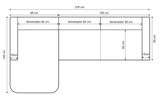 Funda de protección para conjunto de sofá esquinero asimétrico y mesa baja. - Dimensiones del sofá: 185 cm x 275 cm. - Dimensiones de la mesa: 115 cm x 75 cm. - Altura del sofá: 70 cm. - Profundidad del sofá: 95 cm. - Profundidad del asiento: 30 cm.