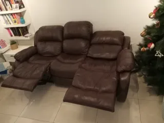 Cómodo sofá de tres plazas con un diseño moderno. - Tapicería de piel sintética. - Color marrón. - Tres asientos independientes con reposapiés abatibles en dos de ellos - Medidas 2'13 metros