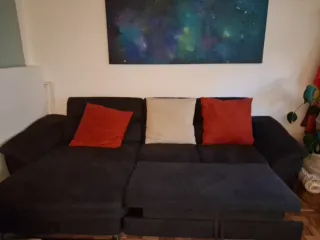 Sofá cama de diseño moderno y confortable, perfecto para cualquier estancia. En perfecto estado. Habria que recogerlo. - Tapicería de tela. - Estructura de madera. - Cojines incluidos.