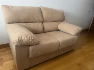 Cómodo sofá de dos plazas con un diseño moderno y mullido. Ideal para tu salón. Cabeceros reclinable y totalmente desenfundable Solo en un trocito está un poco descolorido del sol, por la parte de arriba, resto está bien.
